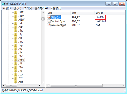 3. 문자열(기본)의 값이 “htmlfile”인지 확인합니다. “htmlfile”이 아니면 마우스 오른쪽 단추로 (기본값)을 클릭하고 수정을 클릭한 후 값 데이터 상자에 htmlfile을 입력하고 확인을 클릭합니다.