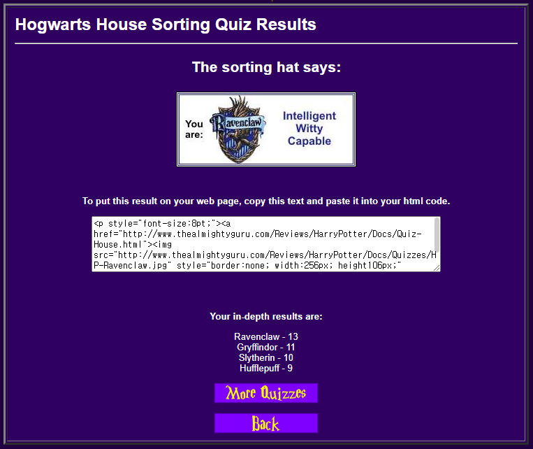 Hogwarts House Sorting Quiz I know what you're all thinking, "Not -another- sorting quiz!", but before you get bored and leave, let me say a few things about it. This is not the ordinary sorting quiz that you're used to. Unlike all those other quizzes infe