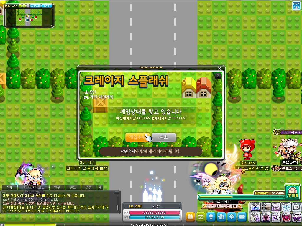 메이플에서 크아를 할 수 있다니!대기 맵에서 전체월드 사람들과 만날 수 있고 무조건 5명이서 싸운다.