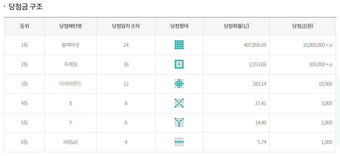 6등은 한줄(바) 4개가 맞으면 당첨이 되는 거군요.그래서 1만원을 받은 저는 다이아몬드 모양으로 3등에 당첨된 것이네요