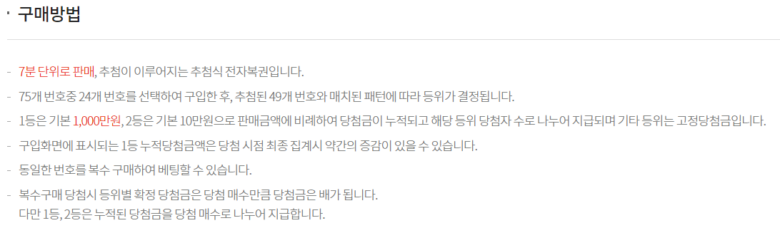 로또나 연금복권처럼 일주일마다 하는게 아니라 7분마다 판매되고 추첨되는 거라 당첨금이 그리 크지 않아요.1등이면 당첨금이 1천만원 플러스 알파인데