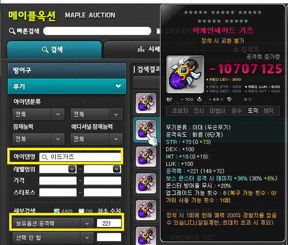 이 때, 방어구 때와 동일하게 무기 또한 작이 된 경우에도 공격력이 221이 넘으면 검색결과에 나오기때문에