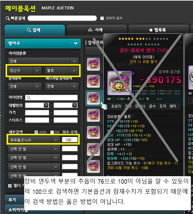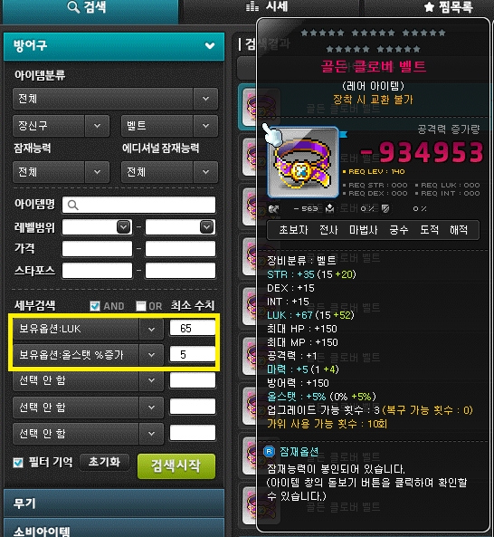 골든 클로버 벨트의 주스탯 기본옵션 LUK은 15이고,