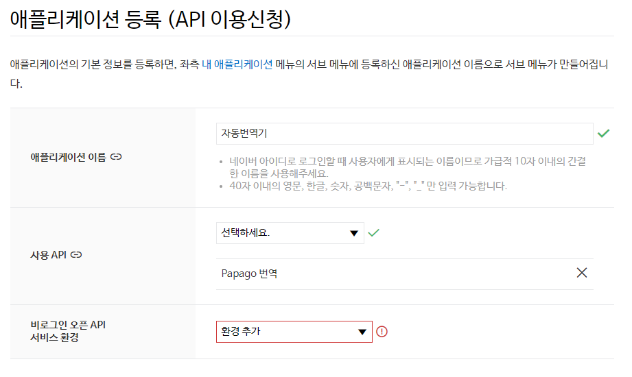 사용 API에서 Papago 번역을 선택한다.