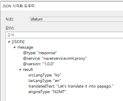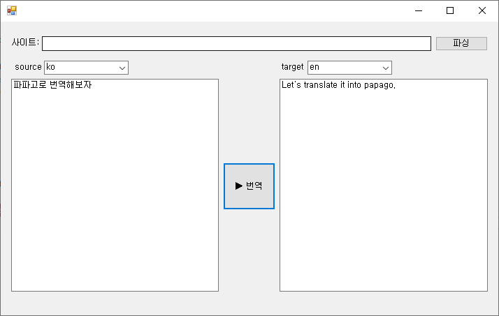 private void Papago() { // 요청 URL string sUrl = "https://openapi.naver.com/v1/papago/n2mt"; // 파라미터에 값넣기 (파파고 NMT API 가이드에서 -d 부분이 파라미터이다) string sParam = string.Format("source={0}&target={1}&text={2}", comboBox1.Text, comboBox2.Text, txtSendText.Text); // 파라미터를 Character Set에 맞게 변경 byte[] bytearry = Encoding.UTF8.GetBytes(sParam); // 서버에 요청 WebRequest webRequest = WebRequest.Create(sUrl); webRequest.Method = "POST"; webRequest.ContentType = "application/x-www-form-urlencoded"; // 헤더 추가하기 (파파고 NMT API 가이드에서 -h 부분이 헤더이다) webRequest.Headers.Add("X-Naver-Client-Id", "네이버 클라이언트 아이디"); webRequest.Headers.Add("X-Naver-Client-Secret", "네이버 클라이언트 시크릿"); // 요청 데이터 길이 webRequest.ContentLength = bytearry.Length; Stream stream = webRequest.GetRequestStream(); stream.Write(bytearry, 0, bytearry.Length); stream.Close(); // 응답 데이터 가져오기(출력포맷) WebResponse webResponse = webRequest.GetResponse(); stream = webResponse.GetResponseStream(); StreamReader streamReader = new StreamReader(stream); string sReturn = streamReader.ReadToEnd(); streamReader.Close(); stream.Close(); webResponse.Close(); JObject jObject = JObject.Parse(sReturn); // JSON 출력포맷에서 필요한 부분(번역된 문장)만 가져오기 txtToText.Text = jObject["message"]["result"]["translatedText"].ToString(); }결과적으로 코드로 표현하면 위와 같다.