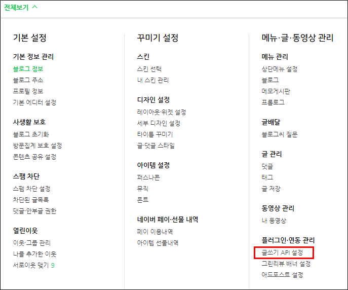 2) 전체보기에서 글쓰기 API 설정을 클릭한다.