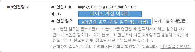 3) API사용을 신청하고(금방 된다) API연결정보에서 API연결 암호를 메모해 둔다.