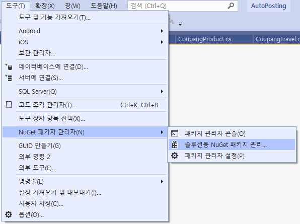[도구] - [NuGet 패키지 관리자] - [솔루션용 NuGet 패키지 관리]를 클릭한다.