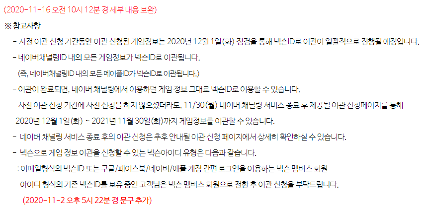 2021년 11월 30일까지 게임정보를 이관할 수 있다.