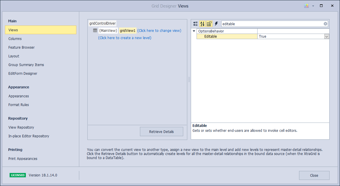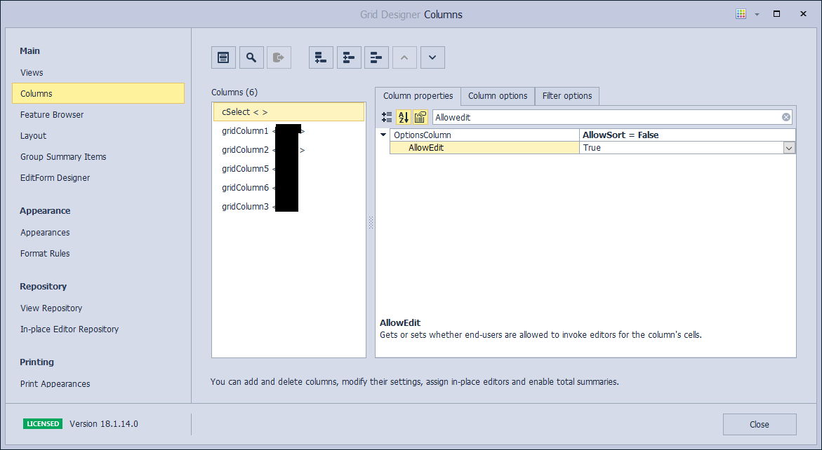 그 다음 Columns에서 각 칼럼별로 OptionsColumn에 AllowEdit에서 설정한다.