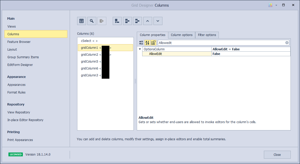 그 다음 Columns에서 각 칼럼별로 OptionsColumn에 AllowEdit에서 설정한다.