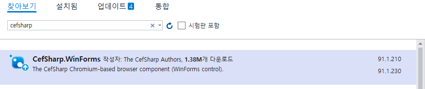 앞서 ChromiumWebBrowser를 사용하려면 NuGet 패키지 관리에서 cefsharp를 검색한 다음 CefSharp.WinForms를 설치하면 된다.