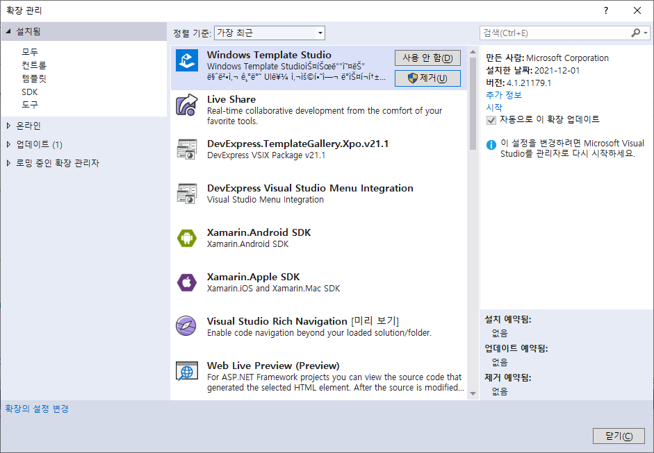 [비주얼 스튜디오 - 확장 - 확장 관리]에서 [Windows Template Studio]를 추가 한다.