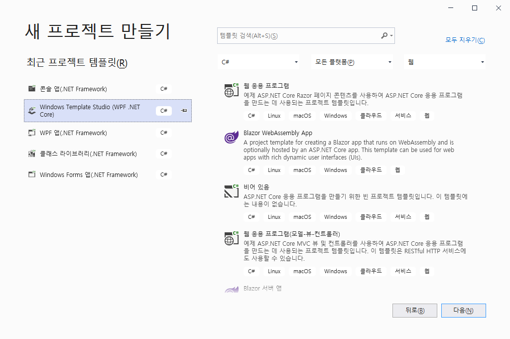 추가 설치가 완료 되면 프로젝트를 Windows Template Studio (WPF .NET Core)로 선택해서 생성 한다.