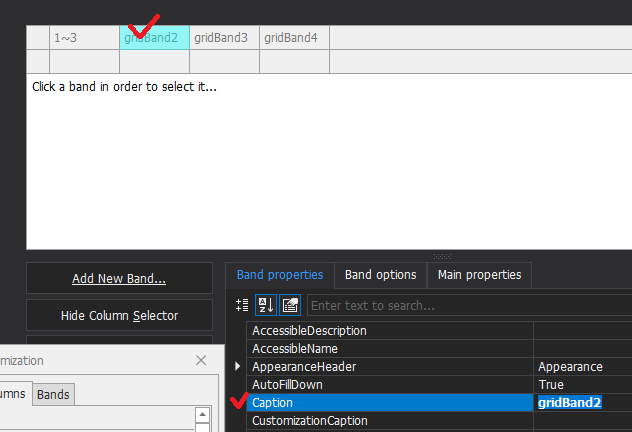 6. 각 gridBand를 클릭하면 속성에서 밴드별 Caption 외에도 여러 정보를 변경할 수 있다.