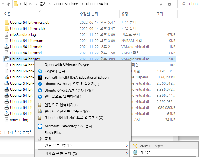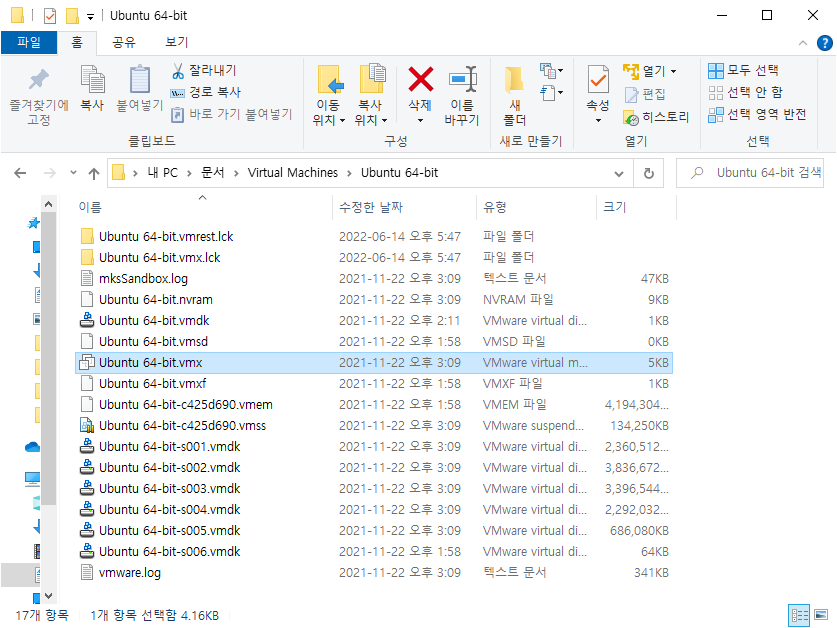 2) VMware 가상머신이 설치된 경로에서 파일 복사 옵션을 추가하고자 하는 OS 폴더에서 *.vmx 파일을 찾는다.