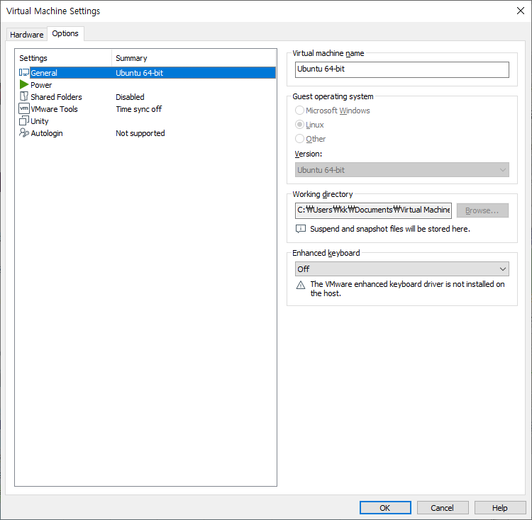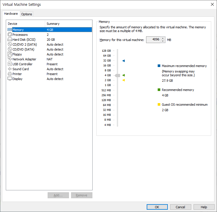 2) 그러면 Virtual Machine Settings 창이 뜬다.