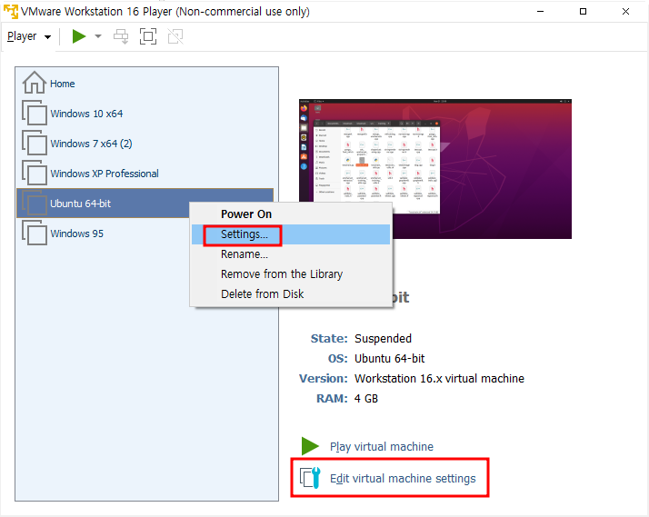 VMware Workstation 16 Player에서 해당 가상머신을 우클릭하여 [Settings...]를 클릭하거나