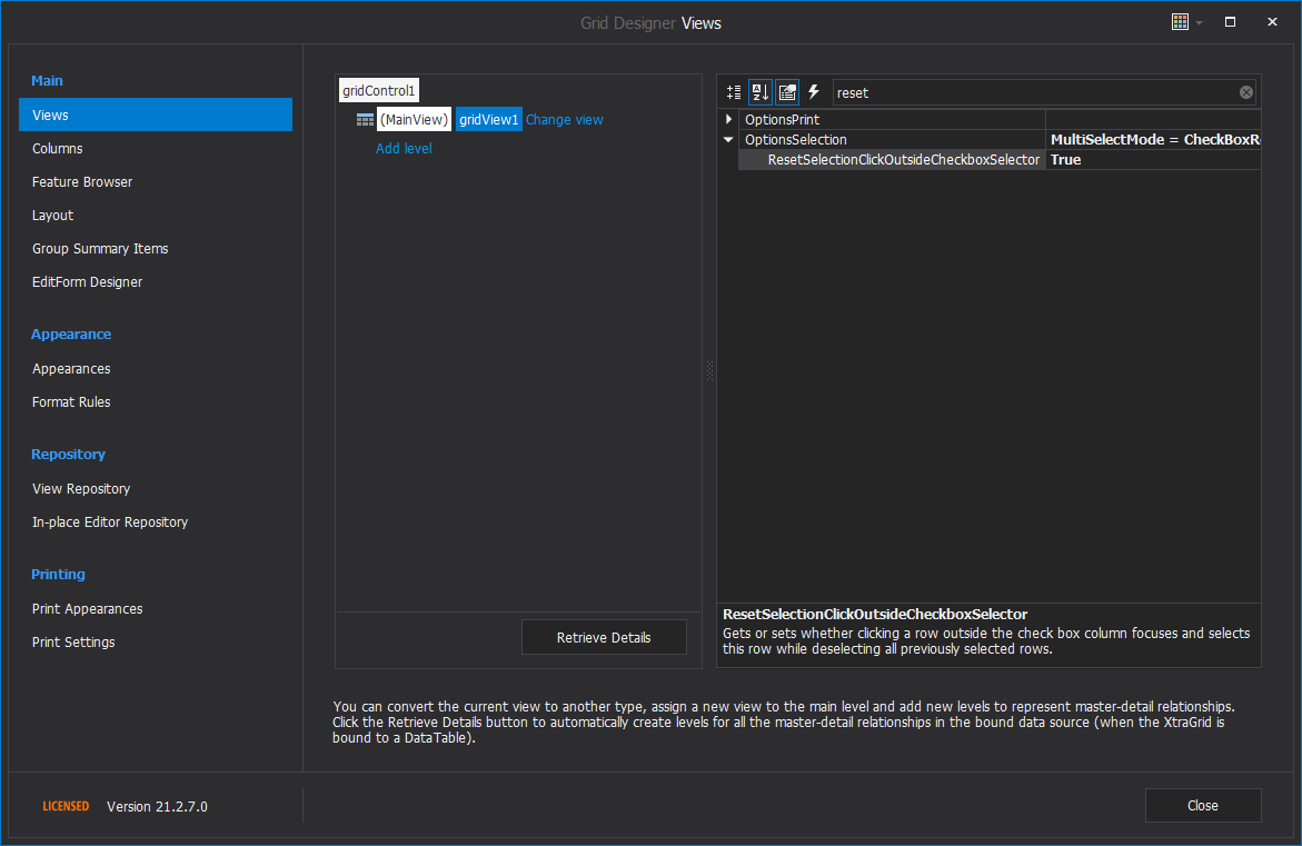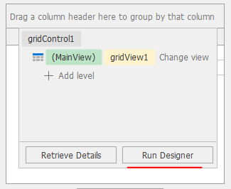 속성에 있는 Run Designer gridControl > Run Designer를 클릭 하여 Grid Designer Views 화면을 띄운다.