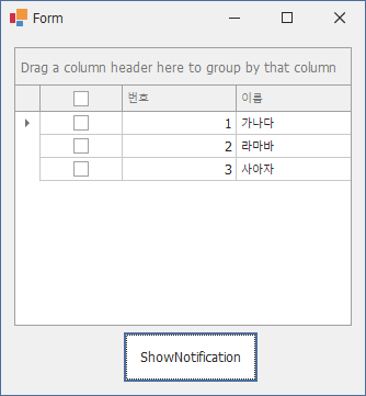 // ShowNotification 버튼을 클릭 하면 체크한 로우의 이름(Name)을 메시지박스로 띄운다. private void simpleButtonShowNotification_Click(object sender, EventArgs e) { foreach (int index in gridView1.GetSelectedRows()) { User user = gridView1.GetRow(index) as User; MessageBox.Show(user.Name); } }CheckChanged 이벤트 관련