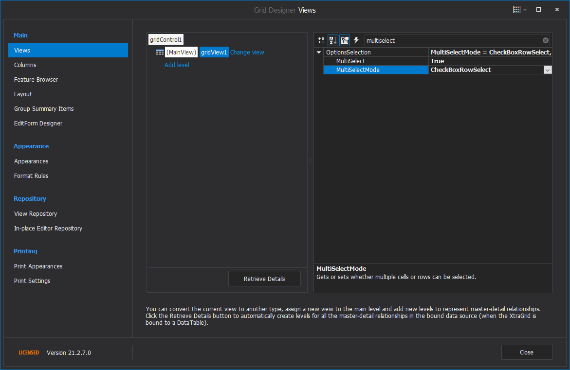 속성에 있는 Run Designer gridControl > Run Designer를 클릭 하여 Grid Designer Views 화면을 띄운다.