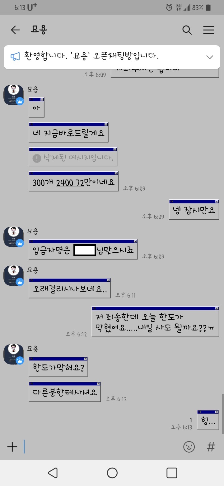 이후 일주일 동안 저 사기꾼은 정아역, 랜덤박스 등 여러 번 다른 닉넴으로 프로필의 닉넴임을 변경 하고, 사기를 치더니 지금은 뭐로 했는지 확인은 불가능하다.
