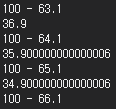 즉, 64.1을 이진수로 변환하면 1000000.0001100110011001100110011001100110011001100110011010...과 같이 무한 소수가 된다. 이진수에서는 유한한 비트 수로 표현하므로, 64.1을 정확히 표현할 수 없다. 따라서 100-64.1은 35.900000000000006과 같이 부동 소수점에 근사치로 계산된다.