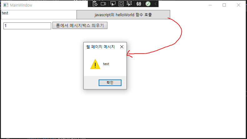 <!DOCTYPE html> <html> <head> <meta charset="utf-8"> <title>자바스크립트 ↔ C# 함수 호출 예제</title> </head> <body> <input type="text" width=200 id="messageBox"> <input type="button" value="폼에서 메시지박스 띄우기" onclick="messageBoxShow()"> <script> function helloWorld(message) { alert(message); } function messageBoxShow() { var textBox = document.getElementById("messageBox").value; window.external.messageBoxShow(textBox); } </script> </body> </html>