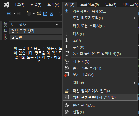비주얼스튜디오 메뉴에서 [Git] - [명령 프롬프트에서 열기]를 클릭한다.