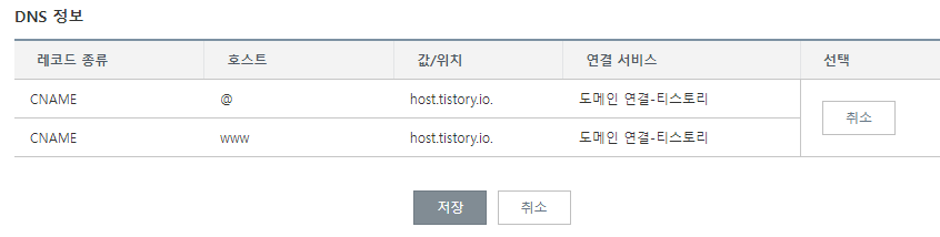 5) CNAME 레코드 두 개가 등록된 것을 확인하고, [저장] 한다.