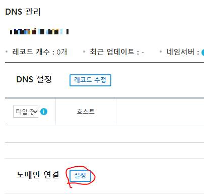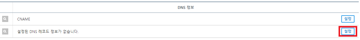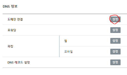 1) 도메인 상세 페이지에서 DNS 정보에 도메인 연결 [설정] 클릭