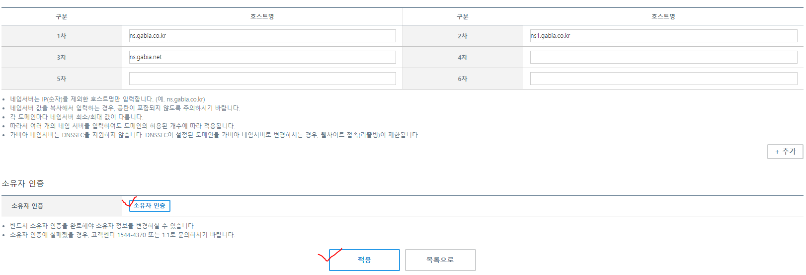 8) 네임서버가 가비아 것으로 바뀐 걸 확인 하고 [소유자 인]증 후 [적용]을 클릭 한다.