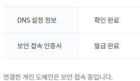 5) 도메인 저장 완료 후에 몇 분 정도 지나면 DNS 설정 정보: 확인 완료, 보안 접속 인증서: 발급 완료가 된다.