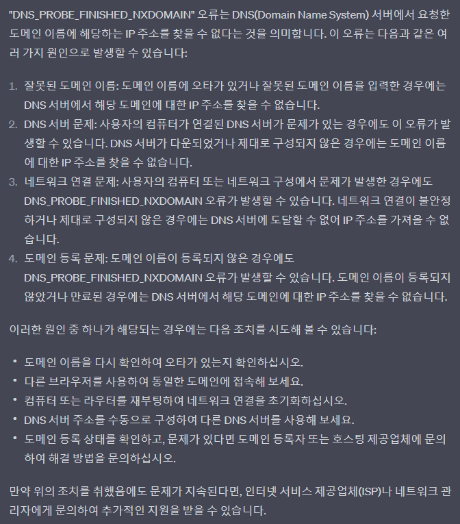 DNS_PROBE_FINISHED_NXDOMAIN 원인에 대한 ChatGPT 답변 나의 경우에는 네임서버가 문제였다.