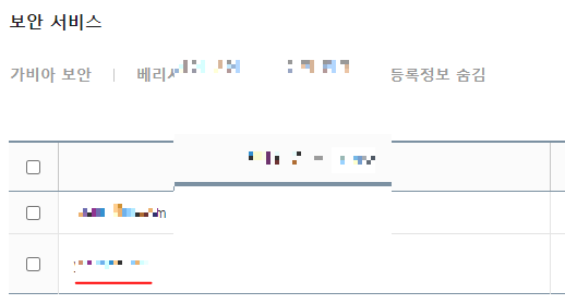 6) 안전 잠금 해지 완료 후 목록으로 돌아가기를 했다면 보안 서비스 화면이 나오고 여기서 네임서버를 변경할 도메인 명을 클릭