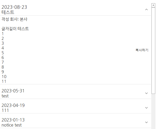 private void GetNotice() { // 기존 요소들을 모두 지우고 새로운 공지사항 요소를 추가할 준비 accordionControl1.Elements.Clear(); // 서버에서 공지사항 데이터를 가져옴 List<Notice> noticeLists = GetUrlRequestModels<Notice>(url, out ResultMeta); if (ResultMeta.Result) { foreach (var item in noticeLists) { // "복사하기" 버튼을 만들고 설정 AccordionContextButton button = new AccordionContextButton(); // 버튼 위치 설정 button.Alignment = DevExpress.Utils.ContextItemAlignment.Center; // 항상 버튼을 보이도록 설정 (마우스 오버 필요 없음) button.Visibility = DevExpress.Utils.ContextItemVisibility.Visible; button.Caption = "복사하기"; button.Tag = item.NoticeContent; button.Click += NoticeContentCopy_Click; // 공지사항 제목을 표시하는 엘리먼트 생성 AccordionControlElement title = new AccordionControlElement(); title.Text = item.NoticeRegDatetime + Environment.NewLine + item.NoticeTitle; title.Style = ElementStyle.Group; // 공지사항 내용을 표시하는 엘리먼트 생성 AccordionControlElement contentElement = new AccordionControlElement(); // "복사하기" 버튼을 내용 엘리먼트에 추가 contentElement.ContextButtons.Add(button); contentElement.Text = item.NoticeContent; // 공지사항 내용 설정 contentElement.Style = ElementStyle.Item; // 제목 엘리먼트에 내용 엘리먼트를 추가 title.Elements.Add(contentElement); // 공지사항 제목 엘리먼트를 AccordionControl에 추가 accordionControl1.Elements.Add(title); } } } private void accordionControl1_CustomDrawElement(object sender, CustomDrawElementEventArgs e) { // 요소의 헤더 배경 그리기 e.DrawHeaderBackground(); // 펼침/접힘 버튼 그리기 e.DrawExpandCollapseButton(); // 이미지 그리기 e.DrawImage(); // 컨텍스트 버튼 그리기 e.DrawContextButtons(); // 텍스트 그리기 e.DrawText(); // 구분선 그리기 함수 호출 DrawSeparator(e.Cache, e.ObjectInfo); // 이벤트 처리 완료 e.Handled = true; }