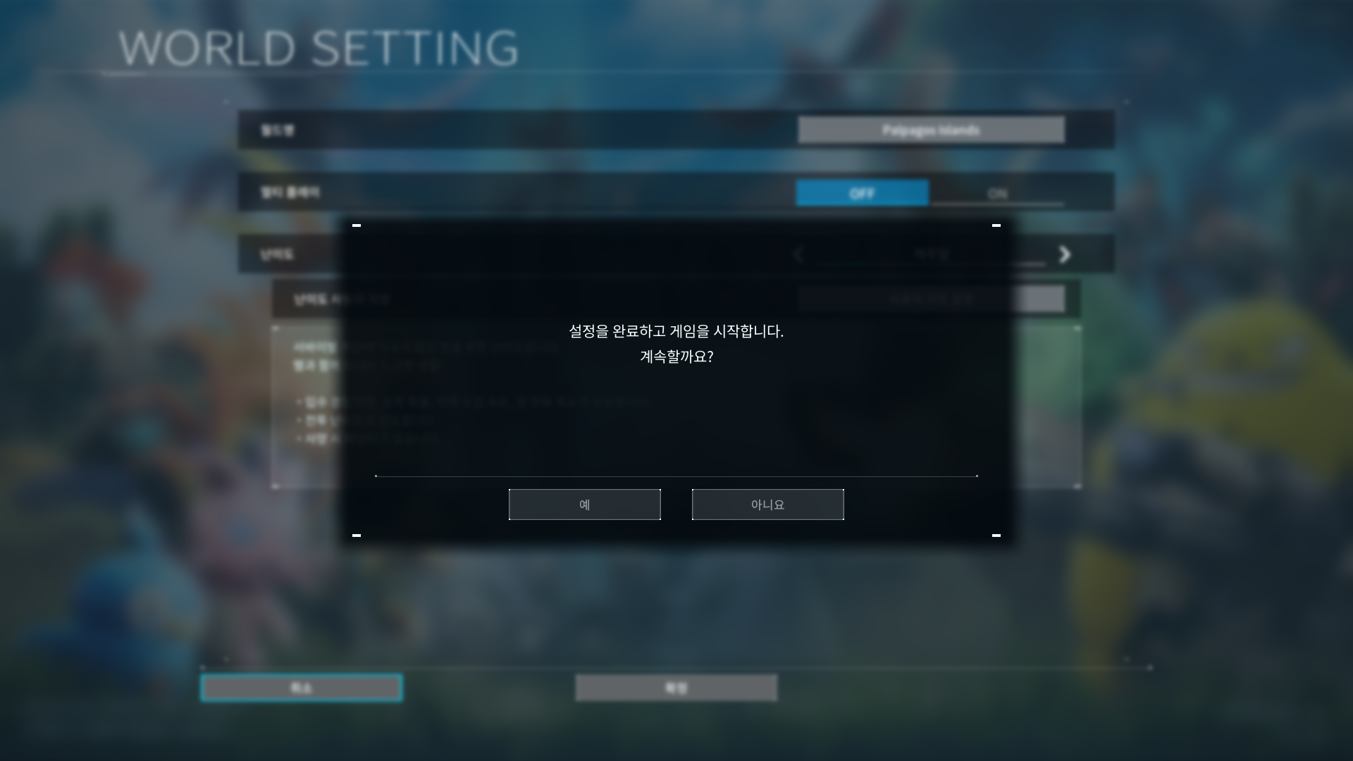 확정을 클릭하면 확인 메시지 창이 뜨고 예를 눌러 게임을 시작한다.