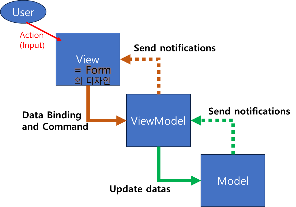 닷넷프레임워크에서의 윈폼에서는 MVP 패턴을 적용하고, 닷넷8에서 윈폼에 MVVM 패턴을 위한 바인딩 기능이 추가됐다고 하여 MVVM 패턴을 적용한다.