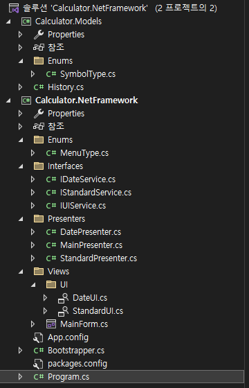 internal class StandardPresenter : IStandardService { StandardUI StandardUI; public StandardPresenter() { StandardUI standardUI = new StandardUI(this); StandardUI = standardUI; } public UserControl CreateUI() { return StandardUI; } public void GetHistory() { History history = new History(); string result = history.InputNumbers.First().ToString(); for (int i = 0; i < history.InputSymbols.Count(); i++) { decimal nextNumber = history.InputNumbers.ElementAt(i + 1); switch (history.InputSymbols.ElementAt(i)) { case SymbolType.Addition: result += " + " + nextNumber; break; case SymbolType.Subtraction: result += " - " + nextNumber; break; case SymbolType.Multiplication: result += " * " + nextNumber; break; case SymbolType.Division: result += " / " + nextNumber; break; } } StandardUI.ShowHistory(result); } }using Calculator.Models.Enums; using System.Collections.Generic; namespace Calculator.Models { public class History { public IEnumerable<decimal> InputNumbers { get; set; } public IEnumerable<SymbolType> InputSymbols { get; set; } public History() { InputNumbers = new List<decimal>() { 123, 456 }; InputSymbols = new List<SymbolType> { SymbolType.Multiplication }; } } }namespace Calculator.Models.Enums { public enum SymbolType { Multiplication, Division, Addition, Subtraction, } }StandardPresenter에서는 데이터를 가져오기 위해 Model과 상호작용을 하는데 이때도 인터페이스를 통해서 하는 방법이 좋지만, 이 프로젝트에는 모델에 비즈니스 로직을 구현하지는 않아서, 하드코딩을 해둔 것만 사용하고 있으므로 다이렉트로 연결해서 사용하는 것을 보여준다.