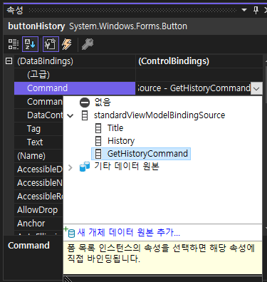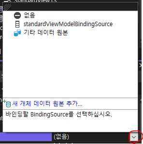 그다음 바인딩소스에서 매칭할 뷰모델의 속성을 선택한다.