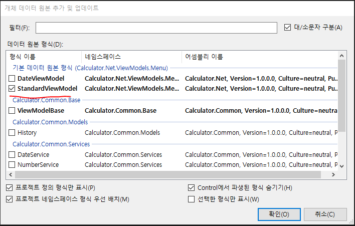 새 개체 데이터 원본 추가에서 뷰모델을 선택하여 데이터 원본을 추가한다.