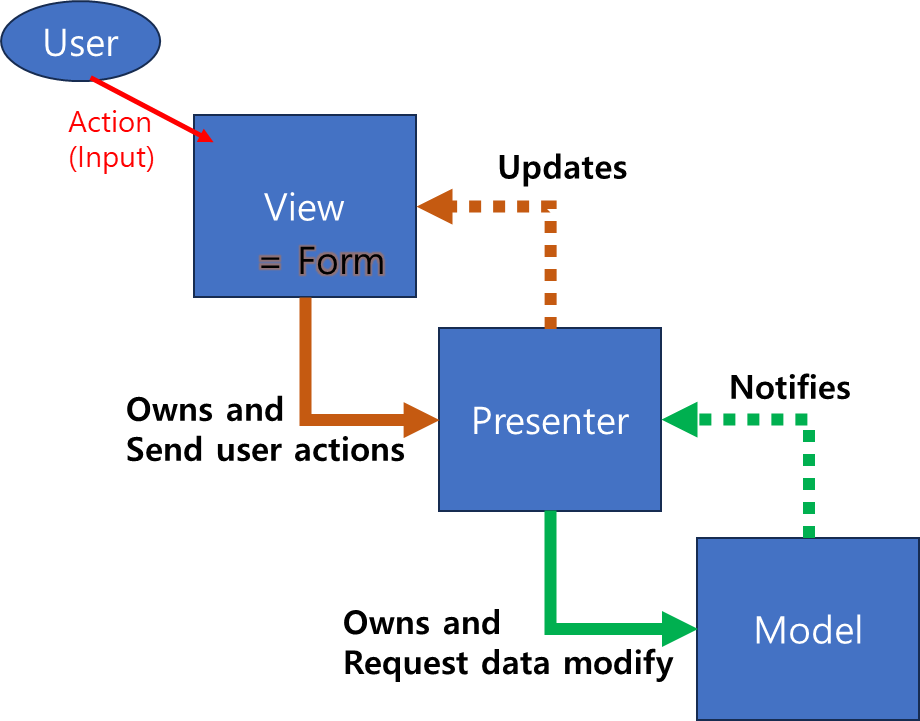 MVP 패턴대로 책임과 역할을 분리하기 위해 Form에서 View와 Presenter, Model이 되는 것을 전부 분리한다. 분리하면 서로 어떻게 상호 작용할까 싶은데 이것은 인터페이스를 이용해서 해결할 수 있다. (=> ISP, DI)