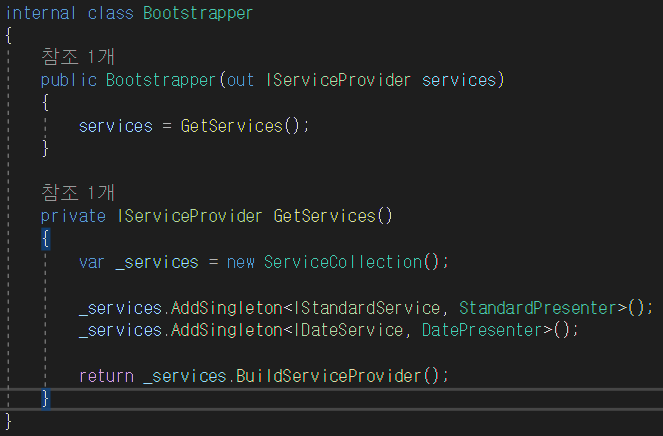 참고로 Interface는 Presenter와 연결되어 있으며 이 서비스 등록 작업은 Program 단에서 어플리케이션을 실행하기 전에 실행되게 코딩되어 있다.