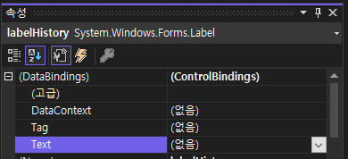 컨트롤의 속성에서 (DataBindings)를 펼치면 바인딩할 수 있는 속성이 나오는데,