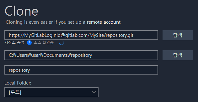 복사한 URL: https://gitlab.com/MySite/repository.git
