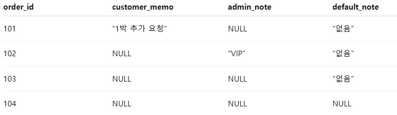 3-1) 우선순위 메모 가져오기SELECT order_id, COALESCE(customer_memo, admin_note, default_note) AS final_note FROM orders;