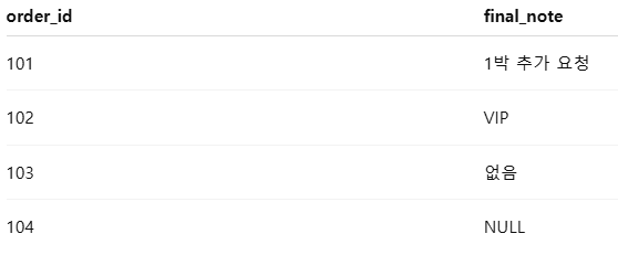 3-1) 우선순위 메모 가져오기SELECT order_id, COALESCE(customer_memo, admin_note, default_note) AS final_note FROM orders;- 해설