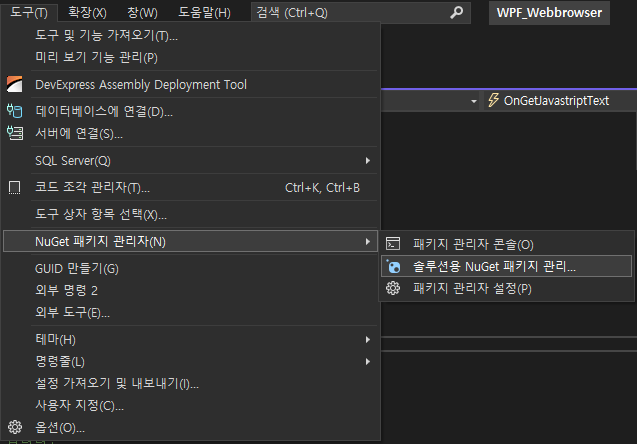 2. [도구]-[NuGet 패키지 관리자]-[솔루션용 NuGet 패키지 관리]에 들어갑니다.