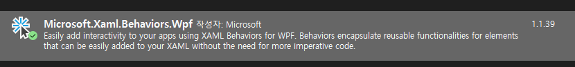 참고로 Microsoft.XamlBehaviors.Wpf는 닷넷프레임워크의 경우 4.5이상부터 되므로 닷넷프레임워크 4.0이면 System.Windows.Interactivity를 검색하여 설치합니다.